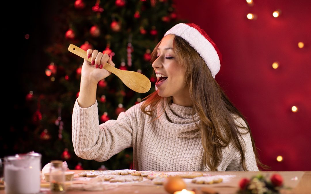 girl in santa hat sings making christmas cookies on red studio Xmas decoration