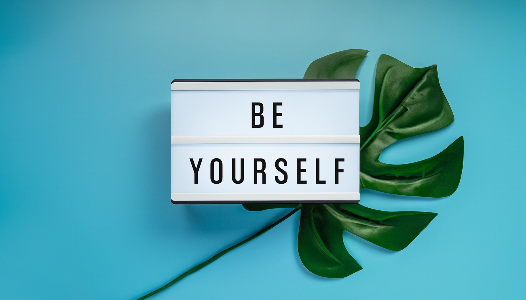 be-yourself-written-light-box-with-tropical-monstera-pink-background