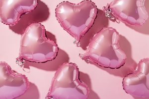 Air balloons heart shape on a pink background. Natural light. Banner. Concept love, wedding, photo zone. Flat lay, top view