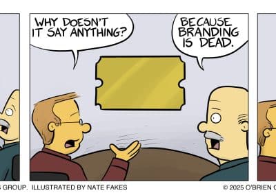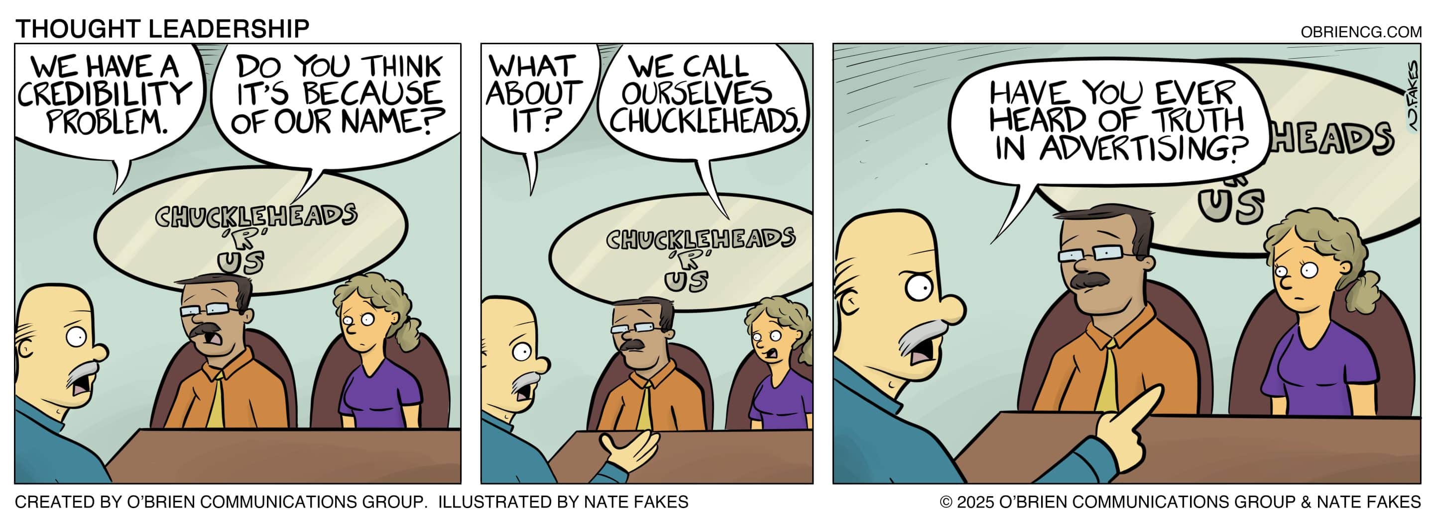 Grandpa O’Brien loved to say, “Charity begins at home.” So, we used BizComics — and co-creator Nate Fakes, a nationally syndicated cartoonist — to develop a strip that would help differentiate us and our creative services from would-be competitors. Thought Leadership was born.