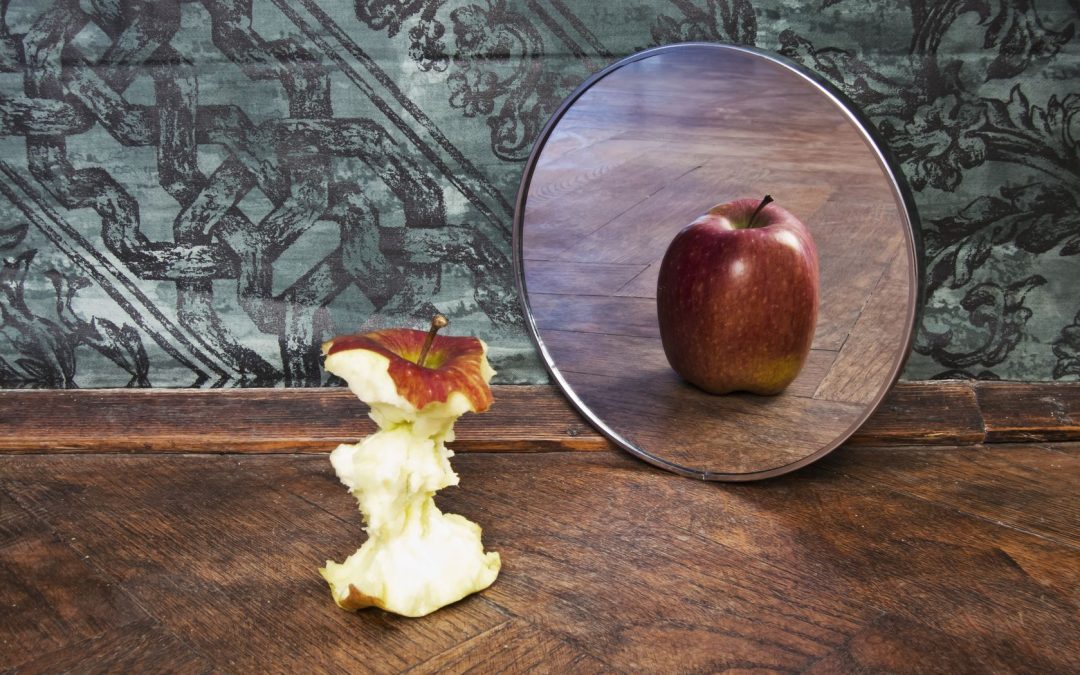 13785697 – surrealistic picture of an apple reflecting in the mirror